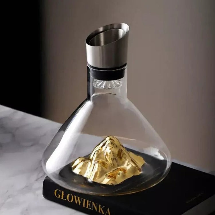 Transforma fiecare moment de degustare intr-o experienta vizuala si gustativa deosebita cu Decantorul Munte de Aur, o piesa spectaculoasa cu un design unic. Interiorul in forma de munte acoperit cu auriu ofera un contrast elegant, perfect pentru a impresiona invitatii sau pentru a face un cadou memorabil.